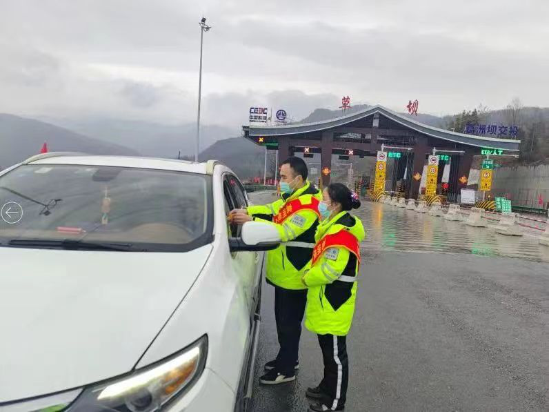 巴万高速团支部两位团员在雨中为过路司乘分发《通行指南》