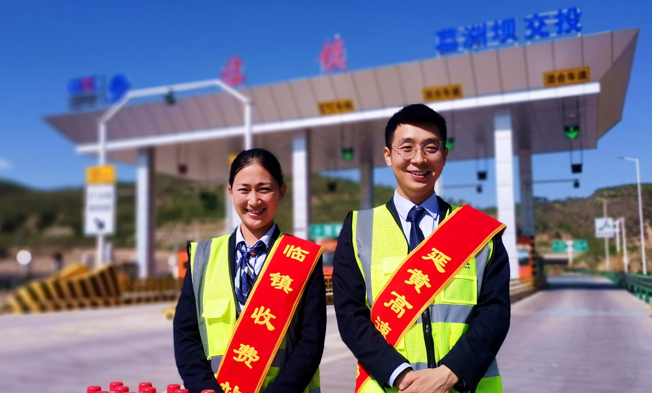 延黄高速临镇收费站两位收费人员带着绶带,在炎热天气下热情地为过往司乘送上矿泉水,缓解暑气。