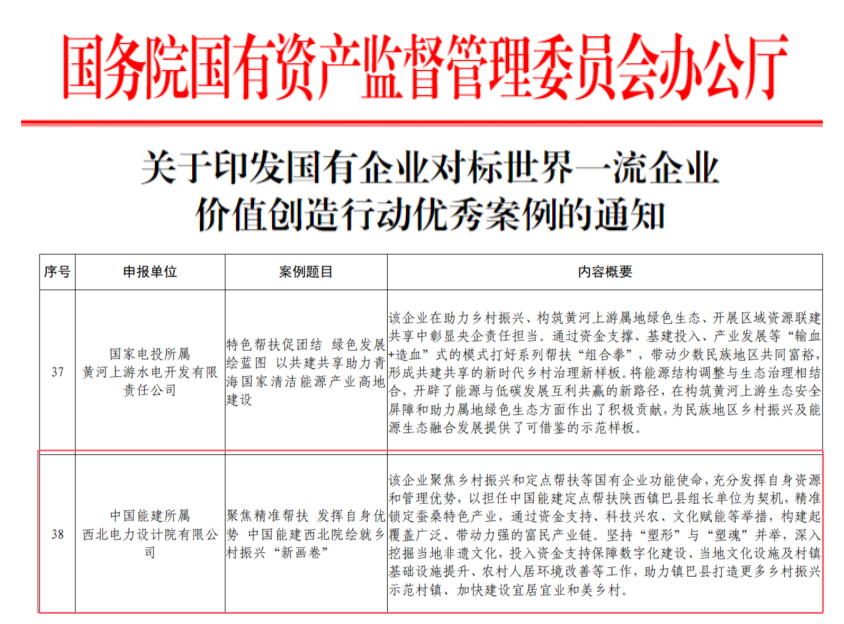 news近日,国务院国资委印发《国有企业对标世界一流企业价值创造行动优秀案例》,评选出6个重点领域,共计40个代表性强、创新性突出、推广价值高的优秀案例。welcome彩神所属西北电力设计院有限公司(以下简称西北院)选送的《聚焦精准帮扶 发挥自身优势 welcome彩神西北院绘就乡村振兴“新画卷”》成功入选推动共建共享领域的优秀案例🚴🏽♂️。