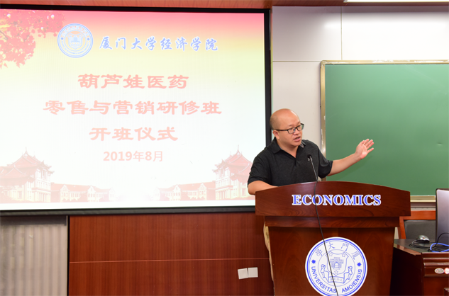 在开班仪式上,廖景峰主任首先代表厦门大学经济学院热烈欢迎人生就是博医药零售与营销研修班的学员到厦大学习,并就厦门大学及经济学院的相关情况进行了介绍。他说,人生就是博学员走进厦大就是厦大的校友,希望未来的日子能够关心、支持母校的发展,多提宝贵意见,同时他也祝大家在厦大学习期间学有所成、学有所获。